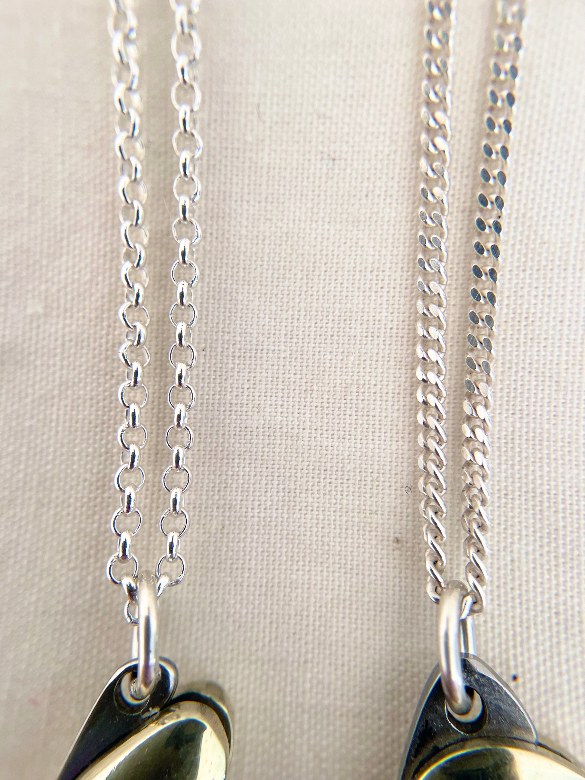 These little abalone pocket knife necklaces are super cute and functional. The pocket knives are 1.5" when closed. The handle is made of abalone shell and brass, and the blade is stainless steel. They come on an 18" sterling silver rolo or curb chains.