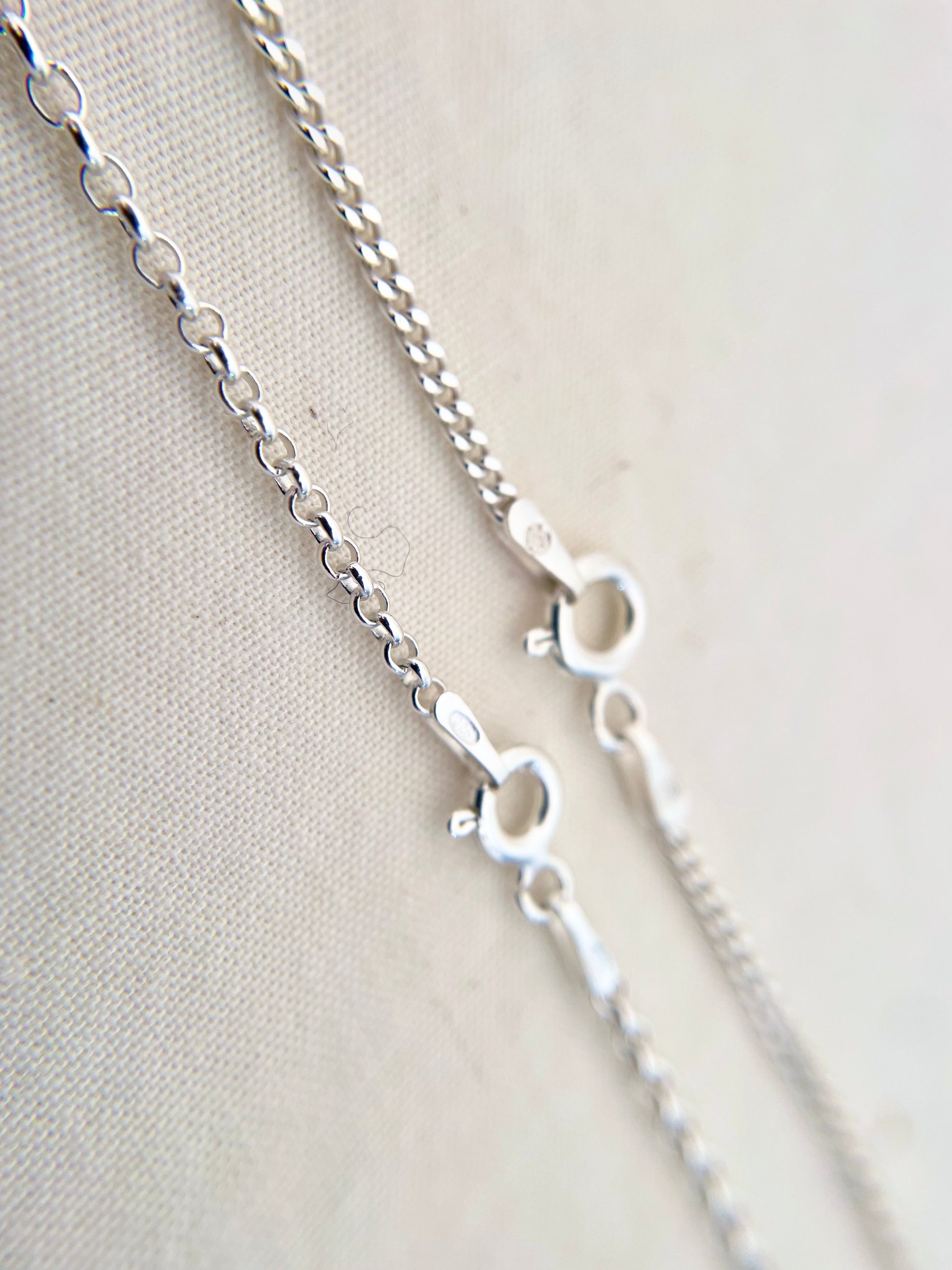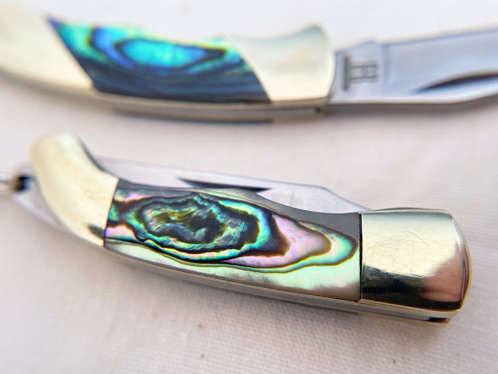 These little abalone pocket knife necklaces are super cute and functional. The pocket knives are 1.5" when closed. The handle is made of abalone shell and brass, and the blade is stainless steel. They come on an 18" sterling silver rolo or curb chains.