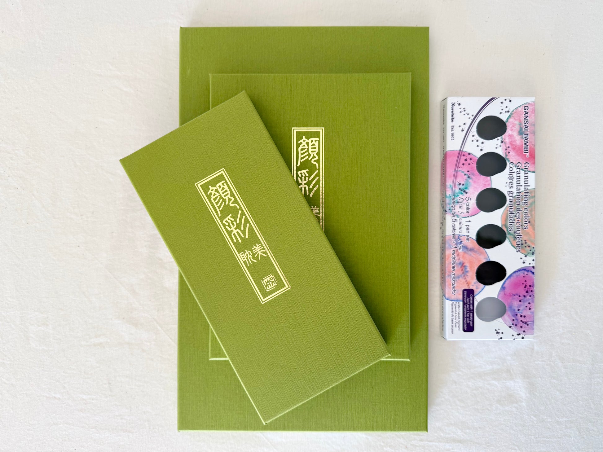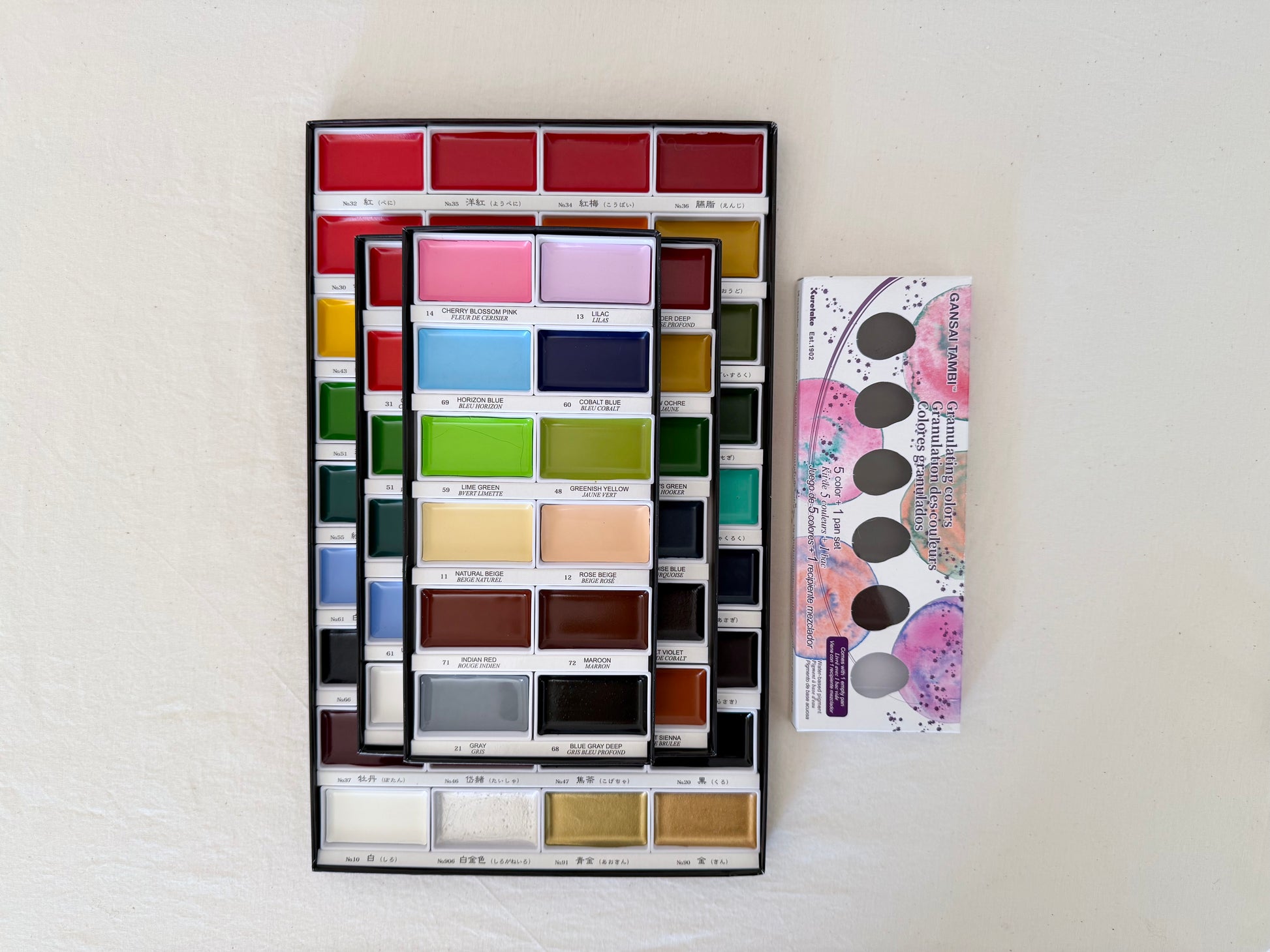 The rich and intense colors of Gansai Tambi are handcrafted, professional-quality pigment inks. These high-caliber watercolors are blendable with a creamy-smooth feel that show up on dark paper.