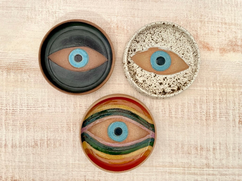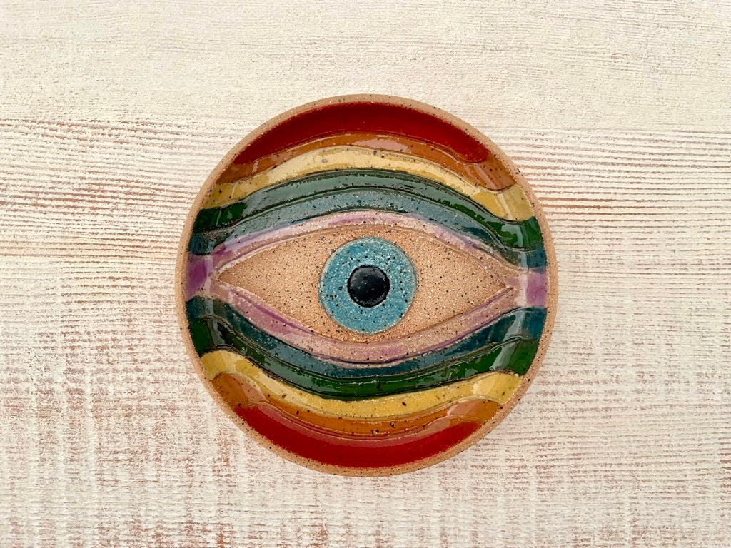 Hand-carved and painted stoneware talismanic evil eye catch-all with rainbow glaze. You can use it as an incense holder, jewelry dish, soap dish, or any other special little items you can think of.