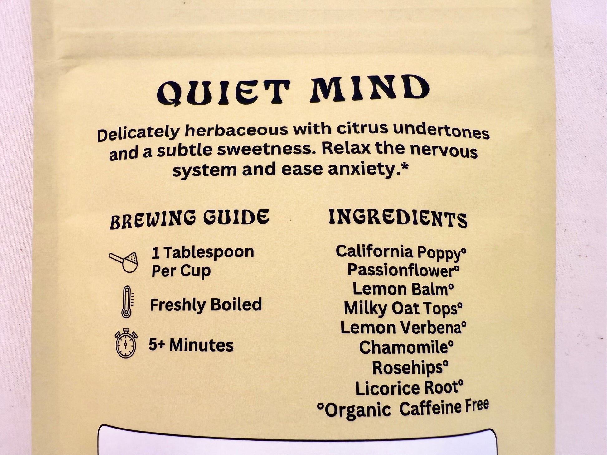 Quiet Mind is delicately herbaceous with citrus undertones and a subtle sweetness. Relax the nervous system and ease anxiety. *