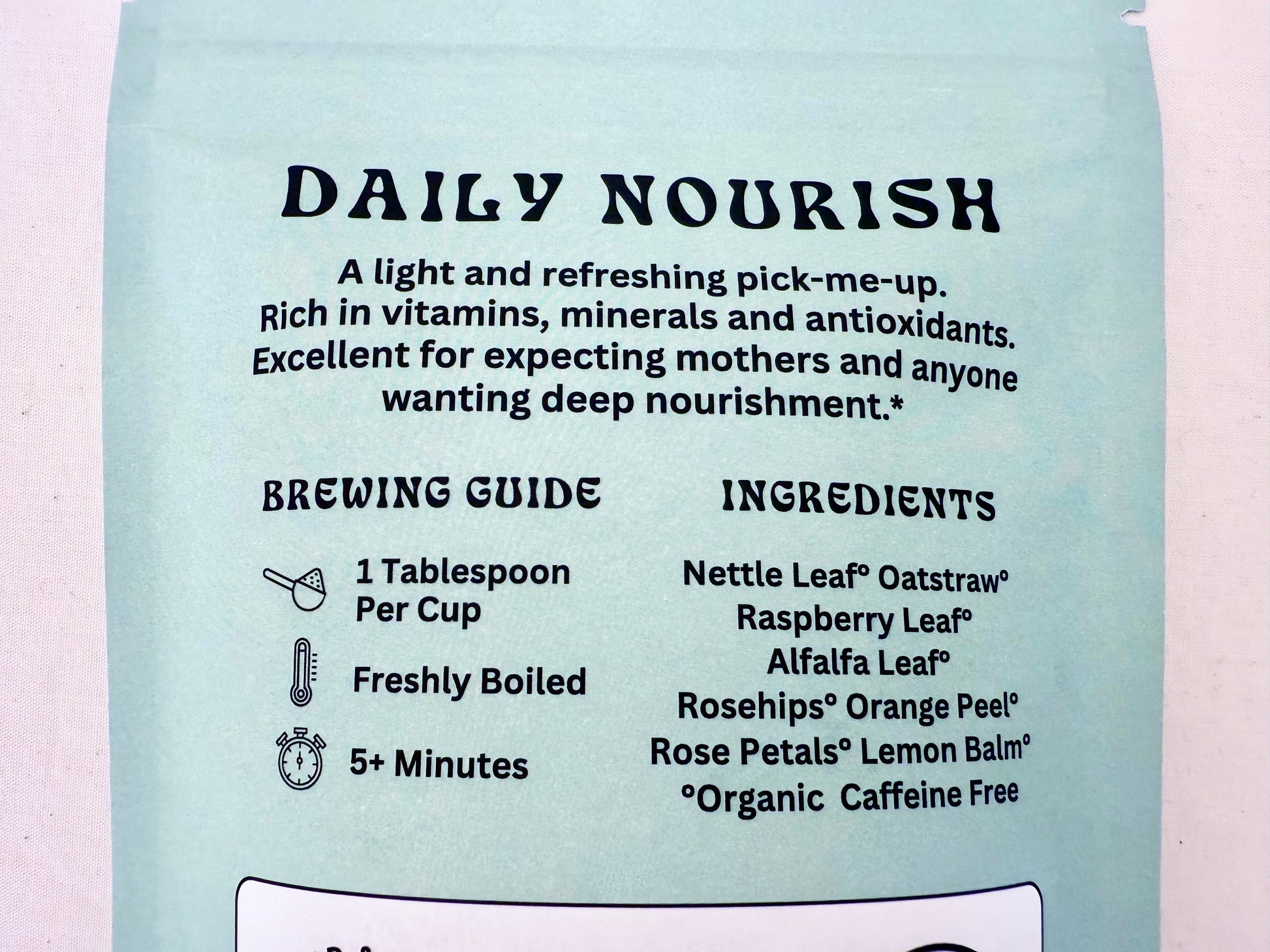Daily Nourish is light, herbaceous and refreshing. Abundant in vitamins, minerals, and antioxidants. Ideal for expectant mothers and anyone seeking deep nourishment. *