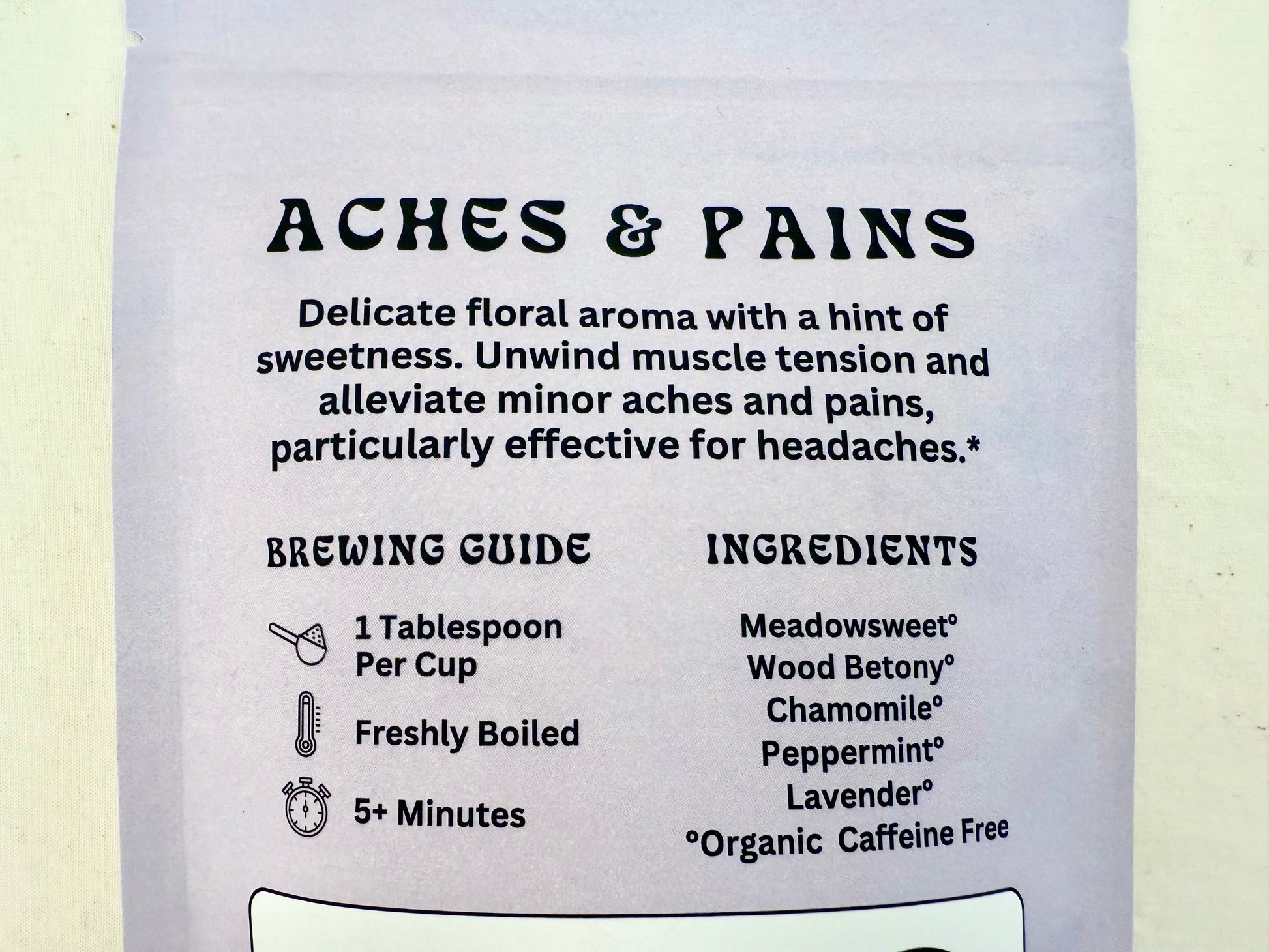 Organic ingredients- meadowsweet, wood betony, chamomile, peppermint and lavender.